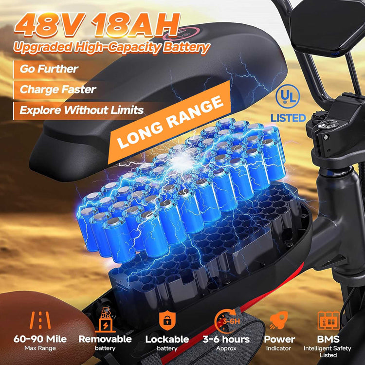 Adventure farther than ever. Powered by a high-capacity, removable 48V 18Ah lithium-ion battery, you can achieve an impressive 60–90 miles on a single charge in pedal-assist mode. Say goodbye to range anxiety for daily commutes, errands, or weekend explorations. The compact, lockable battery easily detaches for secure charging at your home, apartment, or office—anywhere with a standard US power outlet.