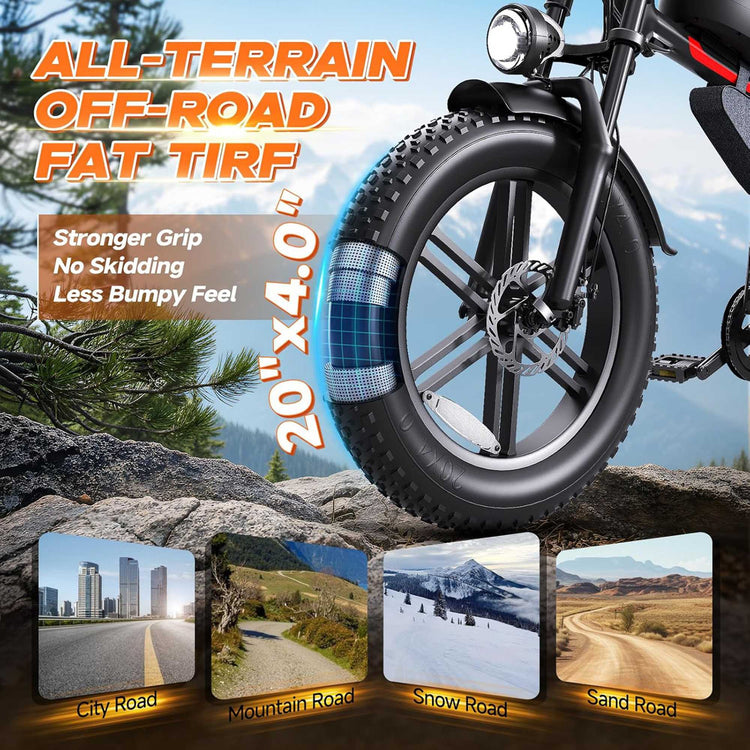 No path is off-limits. Equipped with massive 20" x 4.0" fat tires featuring deep, aggressive treads, this bike floats over sand, plows through snow, grips loose gravel, and smooths out urban potholes. Paired with a front suspension fork, the system absorbs shocks and vibrations, delivering a comfortably controlled and stable ride across the most challenging American landscapes.