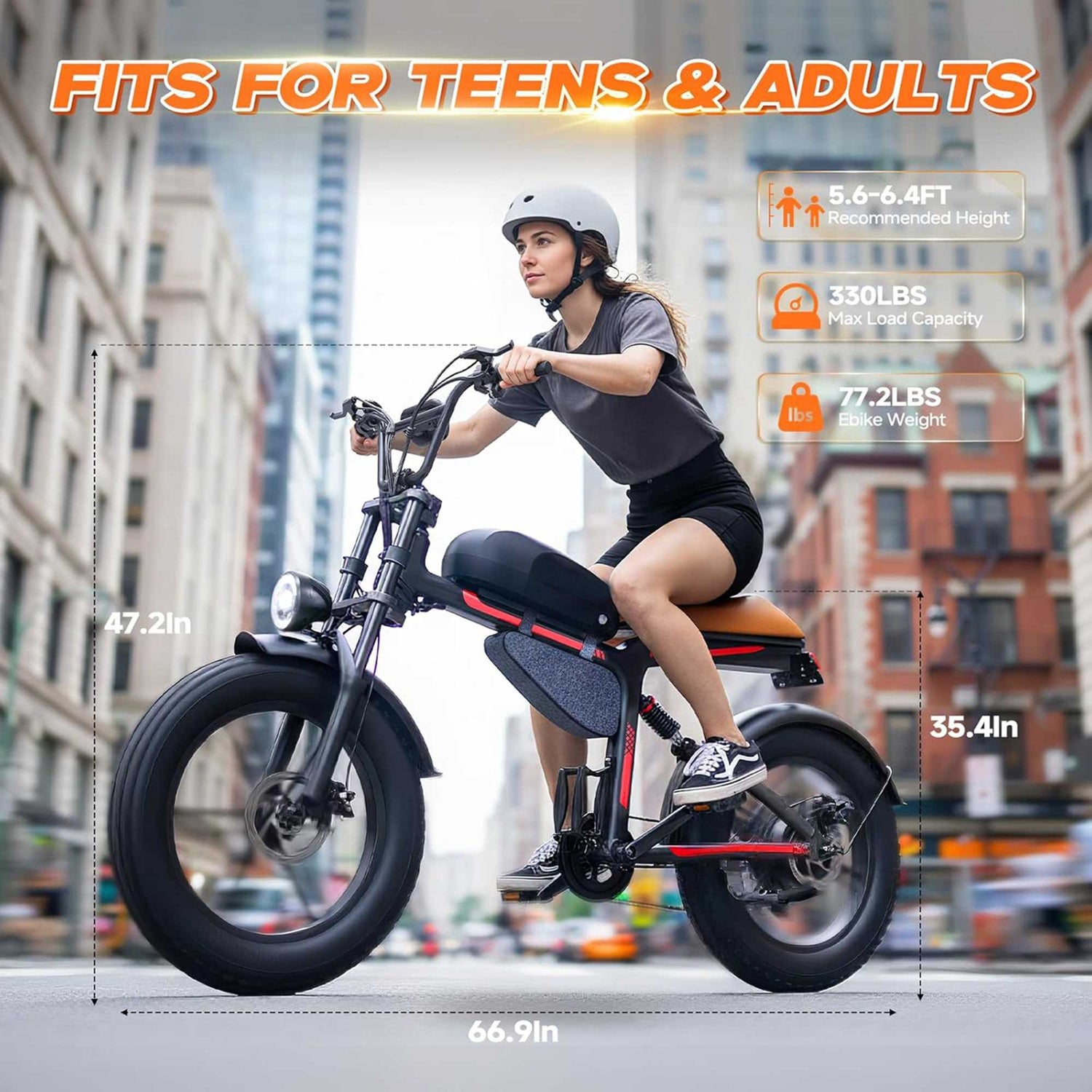 This bike makes a statement. It features a durable, high-tensile steel frame inspired by classic motorcycle aesthetics, built to support riders up to 330 lbs. Modern safety is integrated throughout, including: