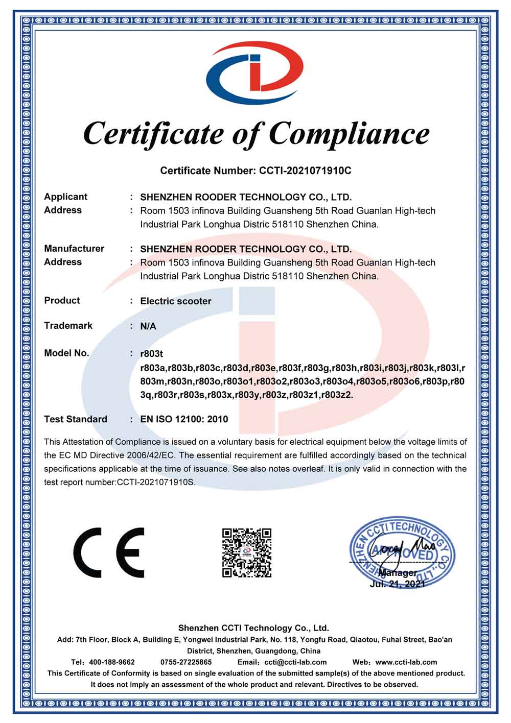 CE MD: CCTI-2021071910C 2006/42/EC